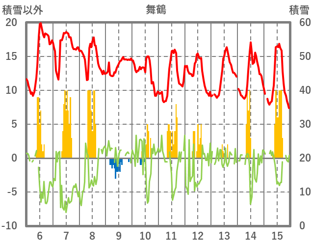 | 日 | 時 | 気温 | 降水 | 風向/風速 | 日照 | 積雪 | 降雪 |