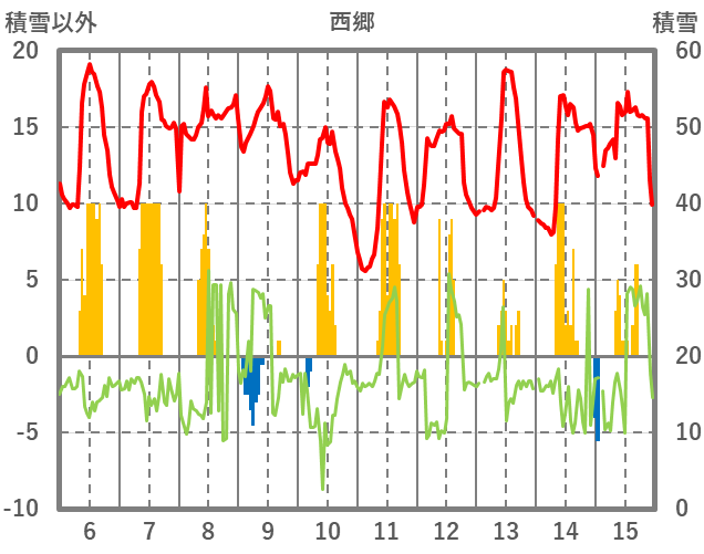 | 日 | 時 | 気温 | 降水 | 風向/風速 | 日照 | 積雪 | 降雪 |