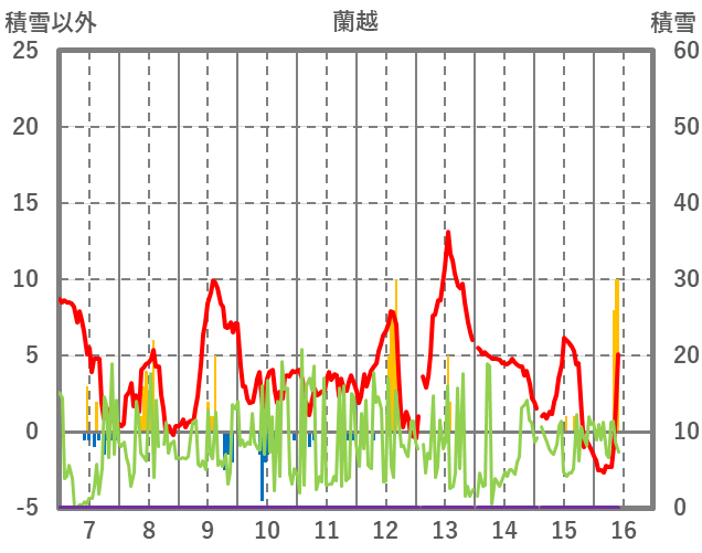 | 日 | 時 | 気温 | 降水 | 風向/風速 | 日照 | 積雪 | 降雪 |