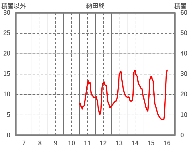 | 日 | 時 | 気温 | 降水 | 風向/風速 | 日照 | 積雪 | 降雪 |