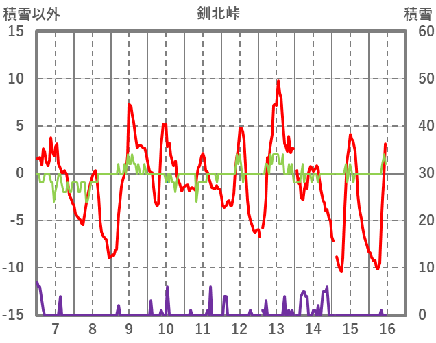 | 日 | 時 | 気温 | 降水 | 風向/風速 | 日照 | 積雪 | 降雪 |
