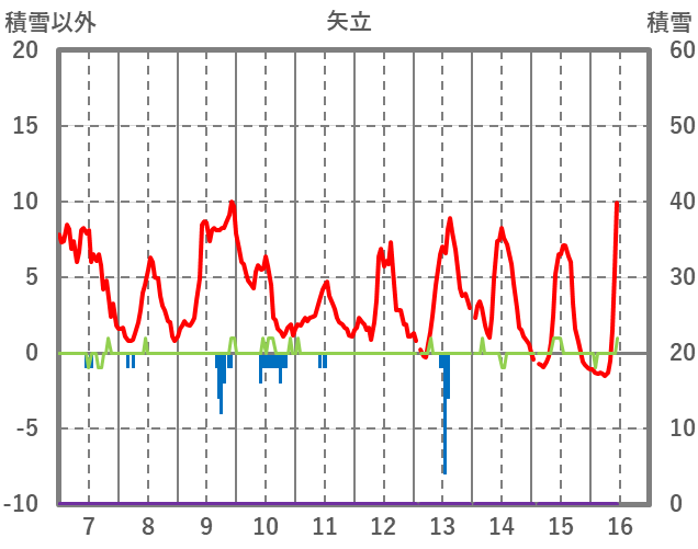| 日 | 時 | 気温 | 降水 | 風向/風速 | 日照 | 積雪 | 降雪 |