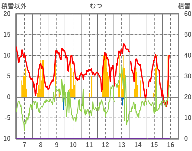 | 日 | 時 | 気温 | 降水 | 風向/風速 | 日照 | 積雪 | 降雪 |