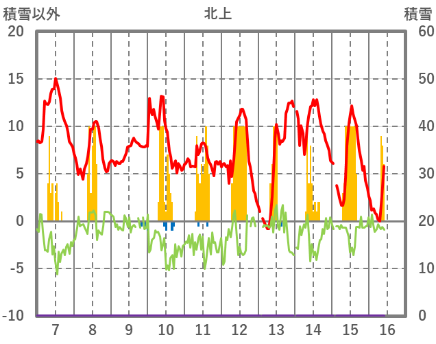 | 日 | 時 | 気温 | 降水 | 風向/風速 | 日照 | 積雪 | 降雪 |
