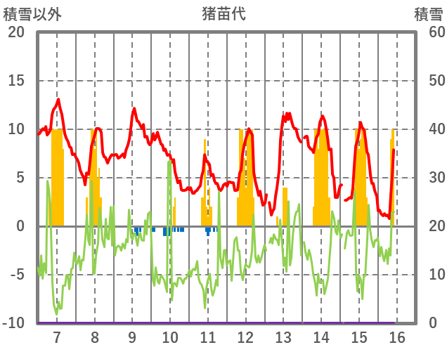 | 日 | 時 | 気温 | 降水 | 風向/風速 | 日照 | 積雪 | 降雪 |