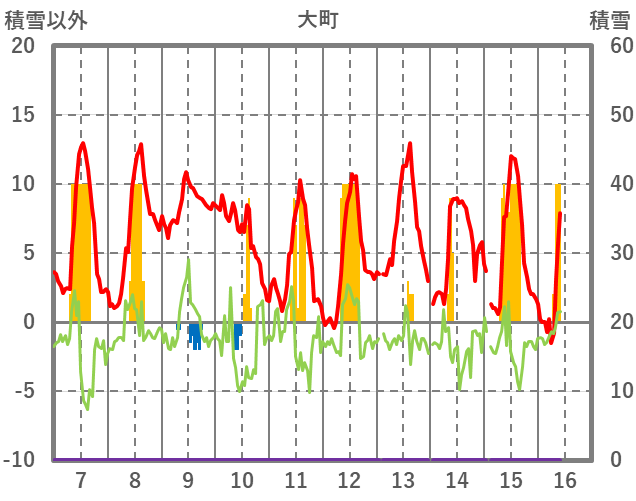 | 日 | 時 | 気温 | 降水 | 風向/風速 | 日照 | 積雪 | 降雪 |