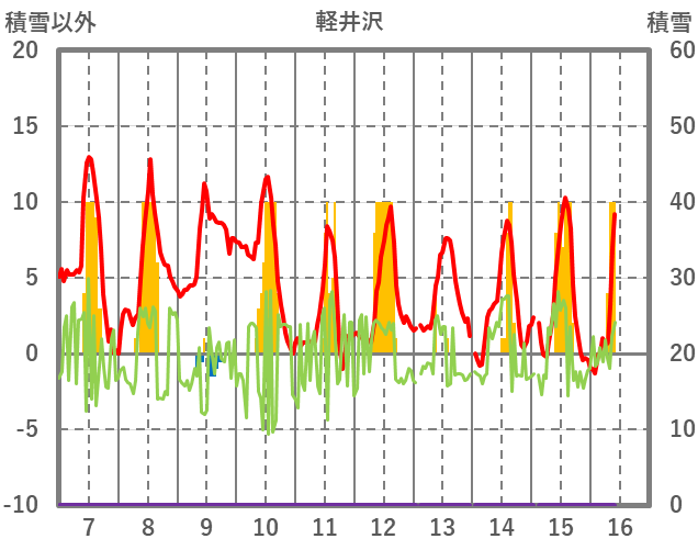| 日 | 時 | 気温 | 降水 | 風向/風速 | 日照 | 積雪 | 降雪 |