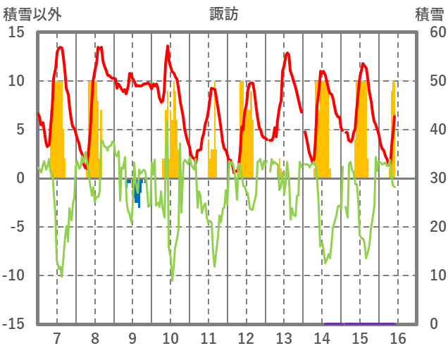 | 日 | 時 | 気温 | 降水 | 風向/風速 | 日照 | 積雪 | 降雪 |