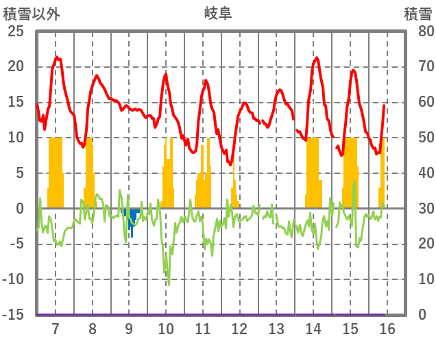 | 日 | 時 | 気温 | 降水 | 風向/風速 | 日照 | 積雪 | 降雪 |