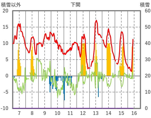 | 日 | 時 | 気温 | 降水 | 風向/風速 | 日照 | 積雪 | 降雪 |