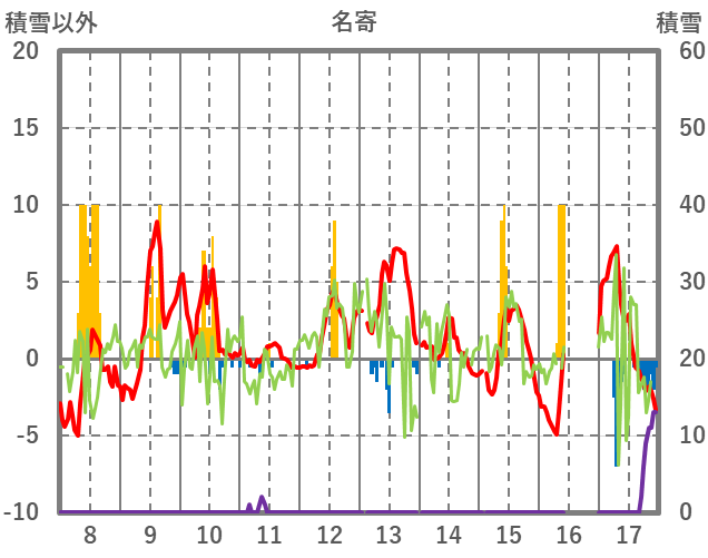 | 日 | 時 | 気温 | 降水 | 風向/風速 | 日照 | 積雪 | 降雪 |
