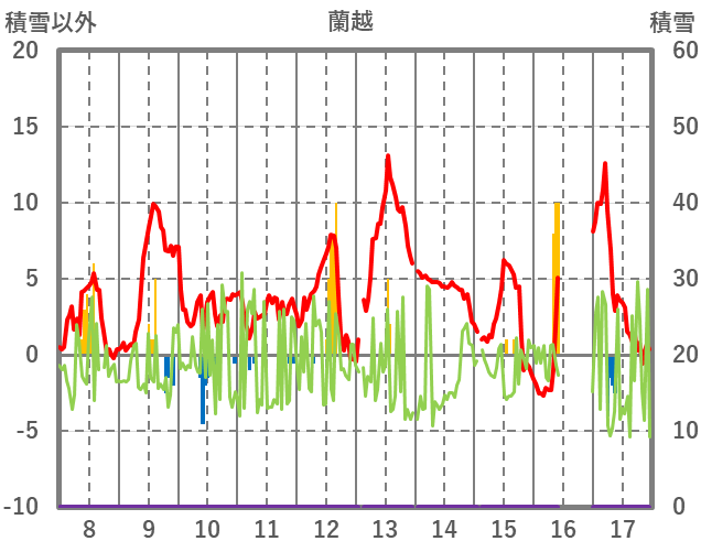 | 日 | 時 | 気温 | 降水 | 風向/風速 | 日照 | 積雪 | 降雪 |