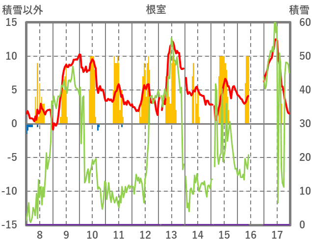 | 日 | 時 | 気温 | 降水 | 風向/風速 | 日照 | 積雪 | 降雪 |