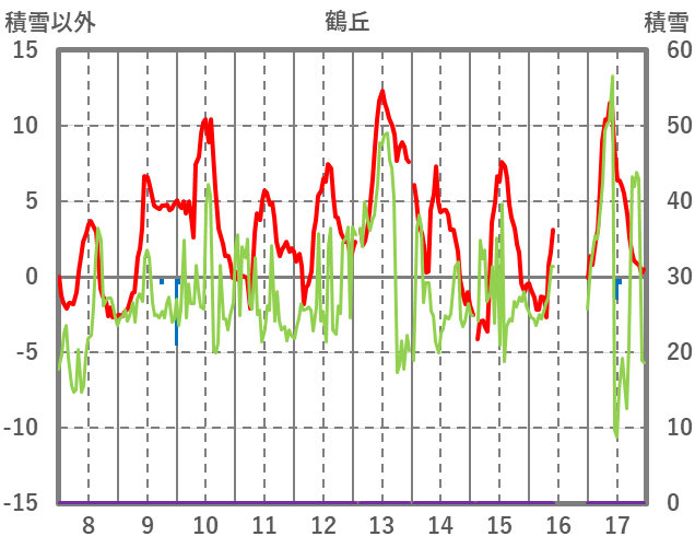 | 日 | 時 | 気温 | 降水 | 風向/風速 | 日照 | 積雪 | 降雪 |