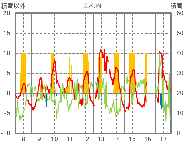 | 日 | 時 | 気温 | 降水 | 風向/風速 | 日照 | 積雪 | 降雪 |