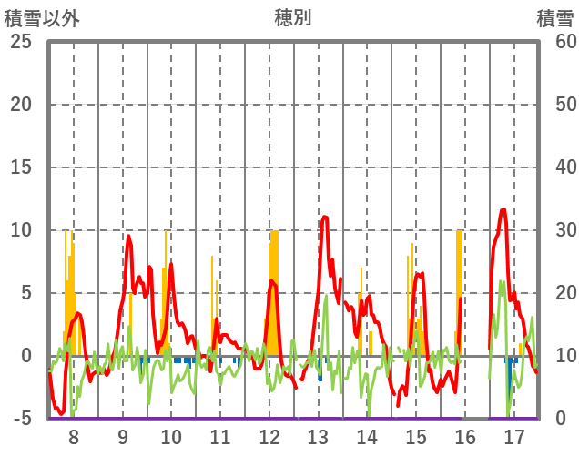 | 日 | 時 | 気温 | 降水 | 風向/風速 | 日照 | 積雪 | 降雪 |