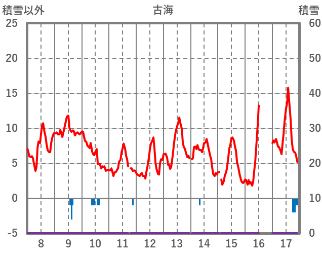 | 日 | 時 | 気温 | 降水 | 風向/風速 | 日照 | 積雪 | 降雪 |