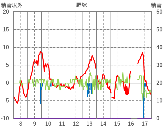 | 日 | 時 | 気温 | 降水 | 風向/風速 | 日照 | 積雪 | 降雪 |