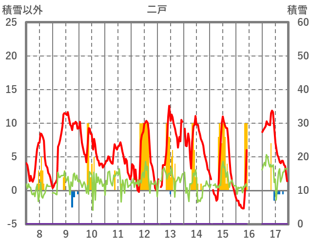 | 日 | 時 | 気温 | 降水 | 風向/風速 | 日照 | 積雪 | 降雪 |