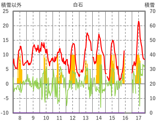 | 日 | 時 | 気温 | 降水 | 風向/風速 | 日照 | 積雪 | 降雪 |