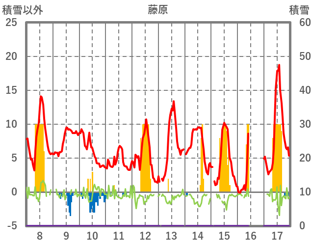 | 日 | 時 | 気温 | 降水 | 風向/風速 | 日照 | 積雪 | 降雪 |
