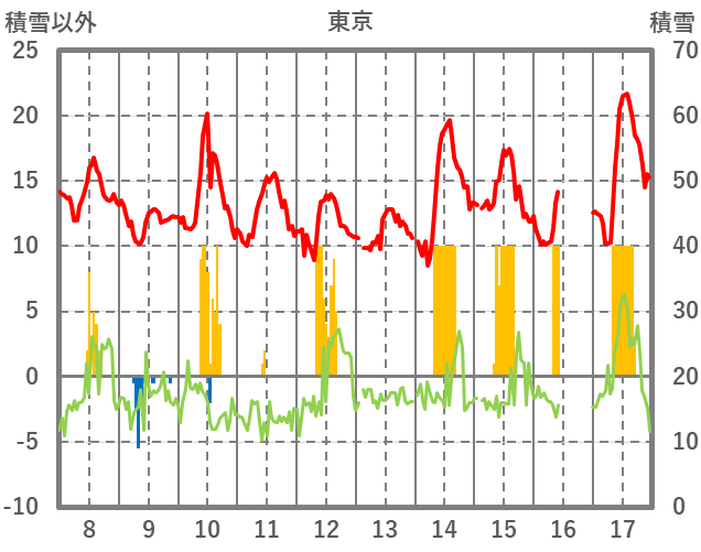 | 日 | 時 | 気温 | 降水 | 風向/風速 | 日照 | 積雪 | 降雪 |