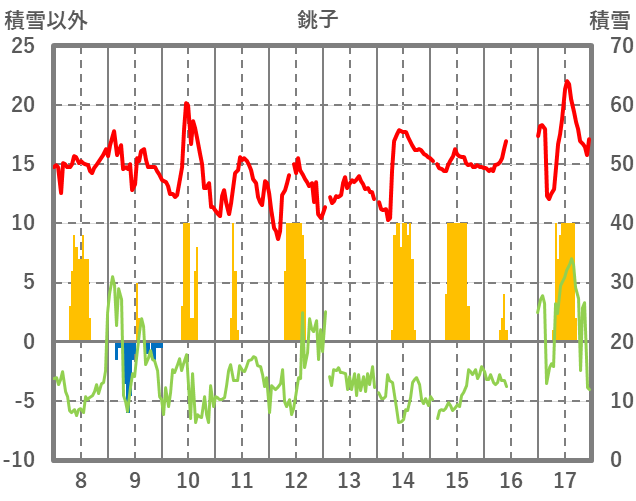 | 日 | 時 | 気温 | 降水 | 風向/風速 | 日照 | 積雪 | 降雪 |