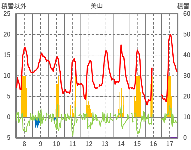 | 日 | 時 | 気温 | 降水 | 風向/風速 | 日照 | 積雪 | 降雪 |