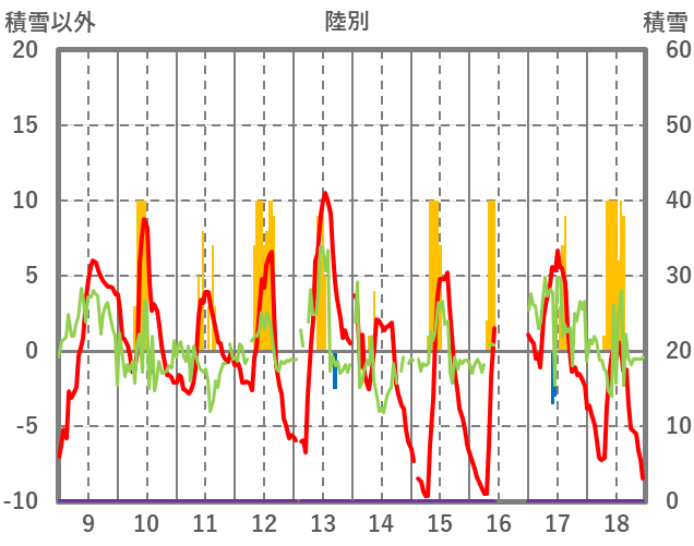 | 日 | 時 | 気温 | 降水 | 風向/風速 | 日照 | 積雪 | 降雪 |