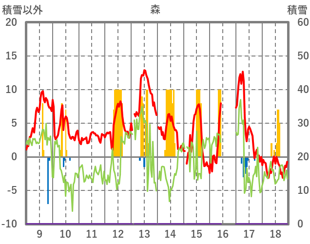 | 日 | 時 | 気温 | 降水 | 風向/風速 | 日照 | 積雪 | 降雪 |