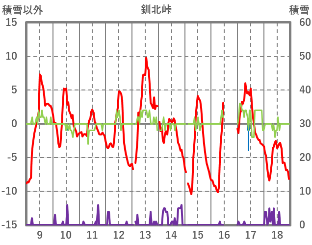| 日 | 時 | 気温 | 降水 | 風向/風速 | 日照 | 積雪 | 降雪 |