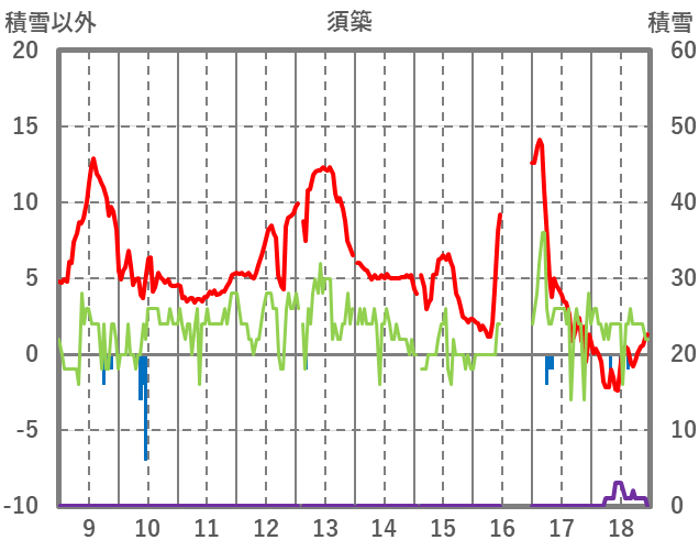 | 日 | 時 | 気温 | 降水 | 風向/風速 | 日照 | 積雪 | 降雪 |