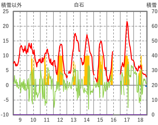 | 日 | 時 | 気温 | 降水 | 風向/風速 | 日照 | 積雪 | 降雪 |