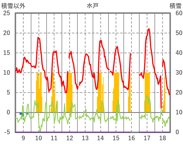 | 日 | 時 | 気温 | 降水 | 風向/風速 | 日照 | 積雪 | 降雪 |