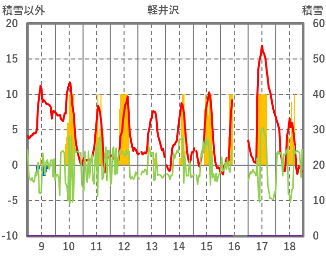 | 日 | 時 | 気温 | 降水 | 風向/風速 | 日照 | 積雪 | 降雪 |