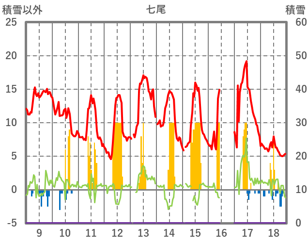 | 日 | 時 | 気温 | 降水 | 風向/風速 | 日照 | 積雪 | 降雪 |