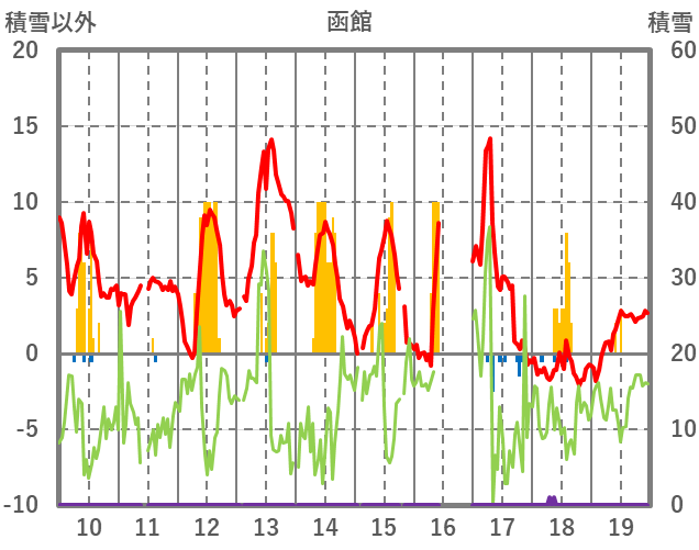| 日 | 時 | 気温 | 降水 | 風向/風速 | 日照 | 積雪 | 降雪 |