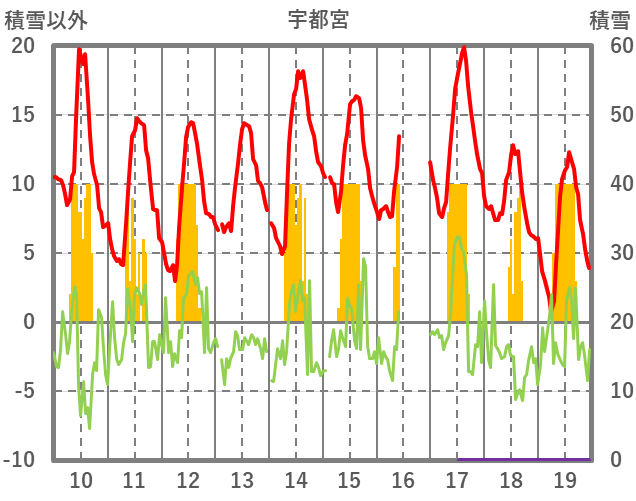 | 日 | 時 | 気温 | 降水 | 風向/風速 | 日照 | 積雪 | 降雪 |