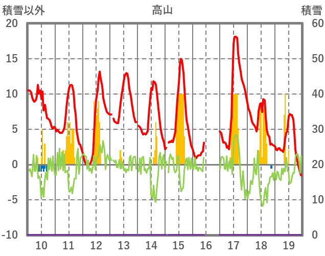 | 日 | 時 | 気温 | 降水 | 風向/風速 | 日照 | 積雪 | 降雪 |