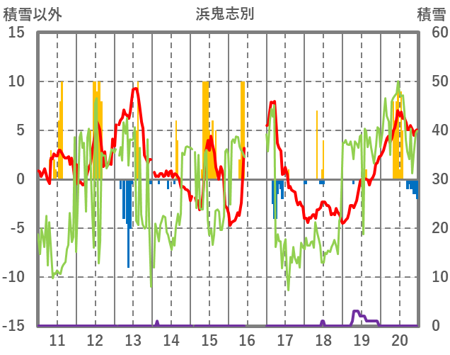 | 日 | 時 | 気温 | 降水 | 風向/風速 | 日照 | 積雪 | 降雪 |