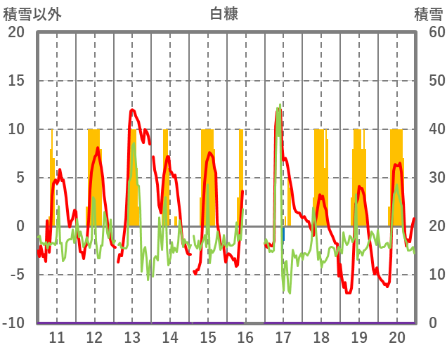 | 日 | 時 | 気温 | 降水 | 風向/風速 | 日照 | 積雪 | 降雪 |