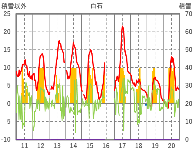 | 日 | 時 | 気温 | 降水 | 風向/風速 | 日照 | 積雪 | 降雪 |