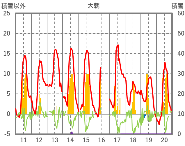 | 日 | 時 | 気温 | 降水 | 風向/風速 | 日照 | 積雪 | 降雪 |