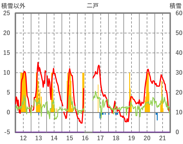 | 日 | 時 | 気温 | 降水 | 風向/風速 | 日照 | 積雪 | 降雪 |