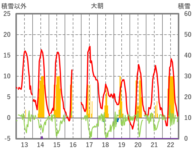 | 日 | 時 | 気温 | 降水 | 風向/風速 | 日照 | 積雪 | 降雪 |