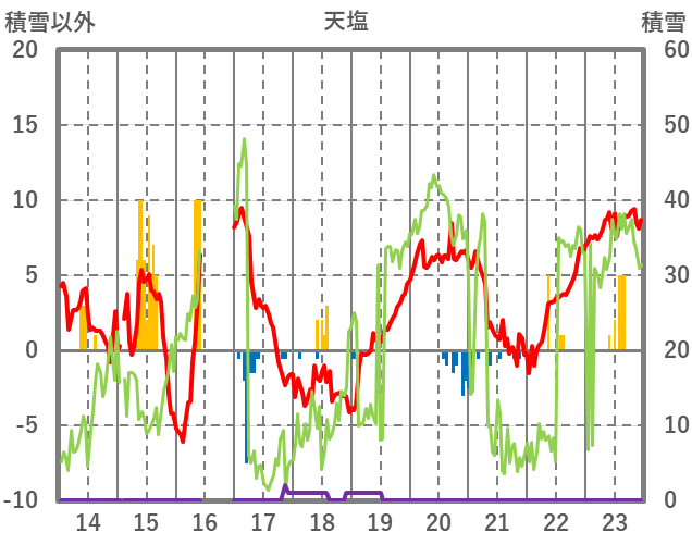 | 日 | 時 | 気温 | 降水 | 風向/風速 | 日照 | 積雪 | 降雪 |