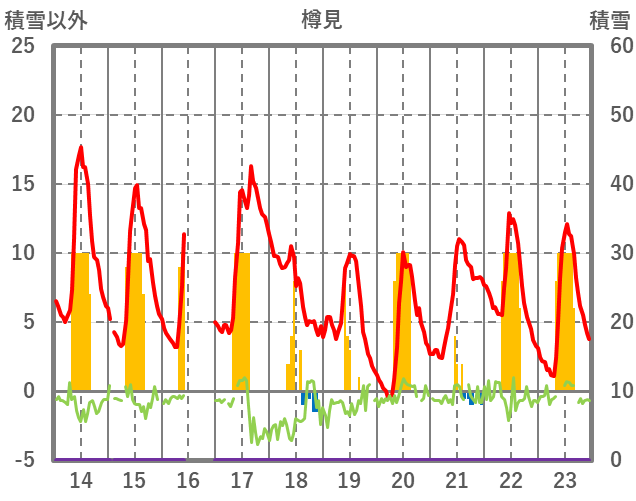 | 日 | 時 | 気温 | 降水 | 風向/風速 | 日照 | 積雪 | 降雪 |