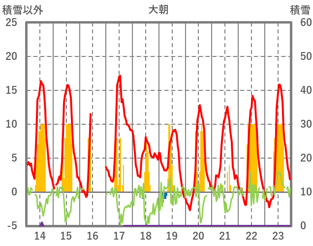 | 日 | 時 | 気温 | 降水 | 風向/風速 | 日照 | 積雪 | 降雪 |