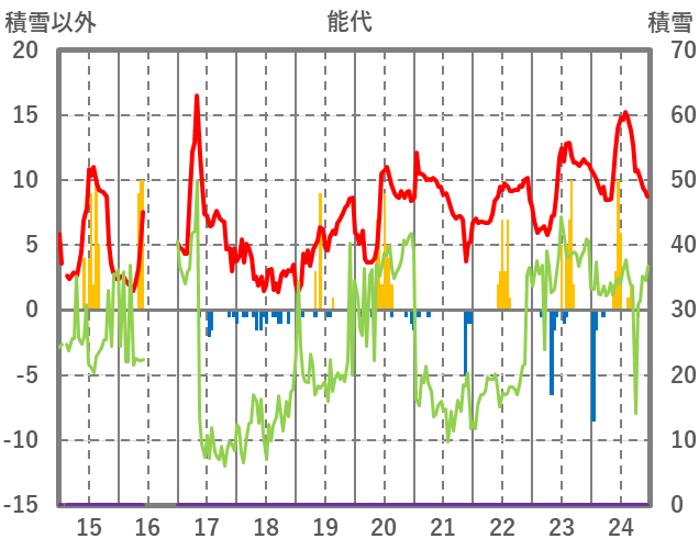 | 日 | 時 | 気温 | 降水 | 風向/風速 | 日照 | 積雪 | 降雪 |