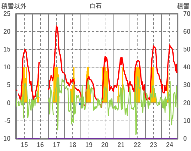 | 日 | 時 | 気温 | 降水 | 風向/風速 | 日照 | 積雪 | 降雪 |